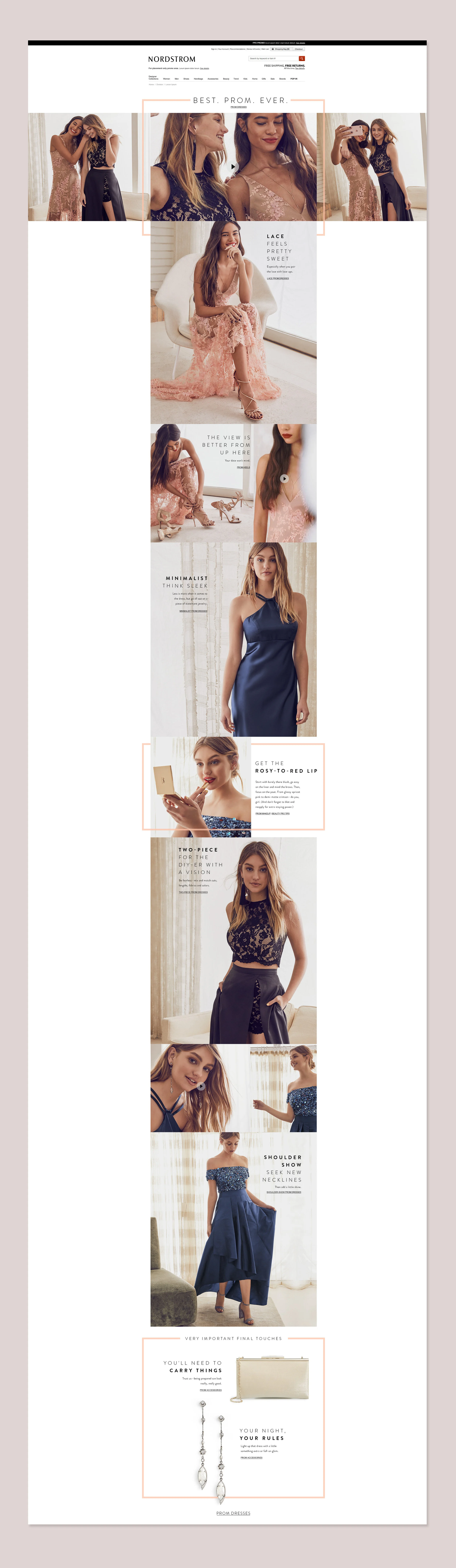 The goal of Prom was to make Nordstrom a more prominent shopping destination for dresses, accessories, shoes and beauty products. The concept we executed was cross divisional one stop shop for Prom.
